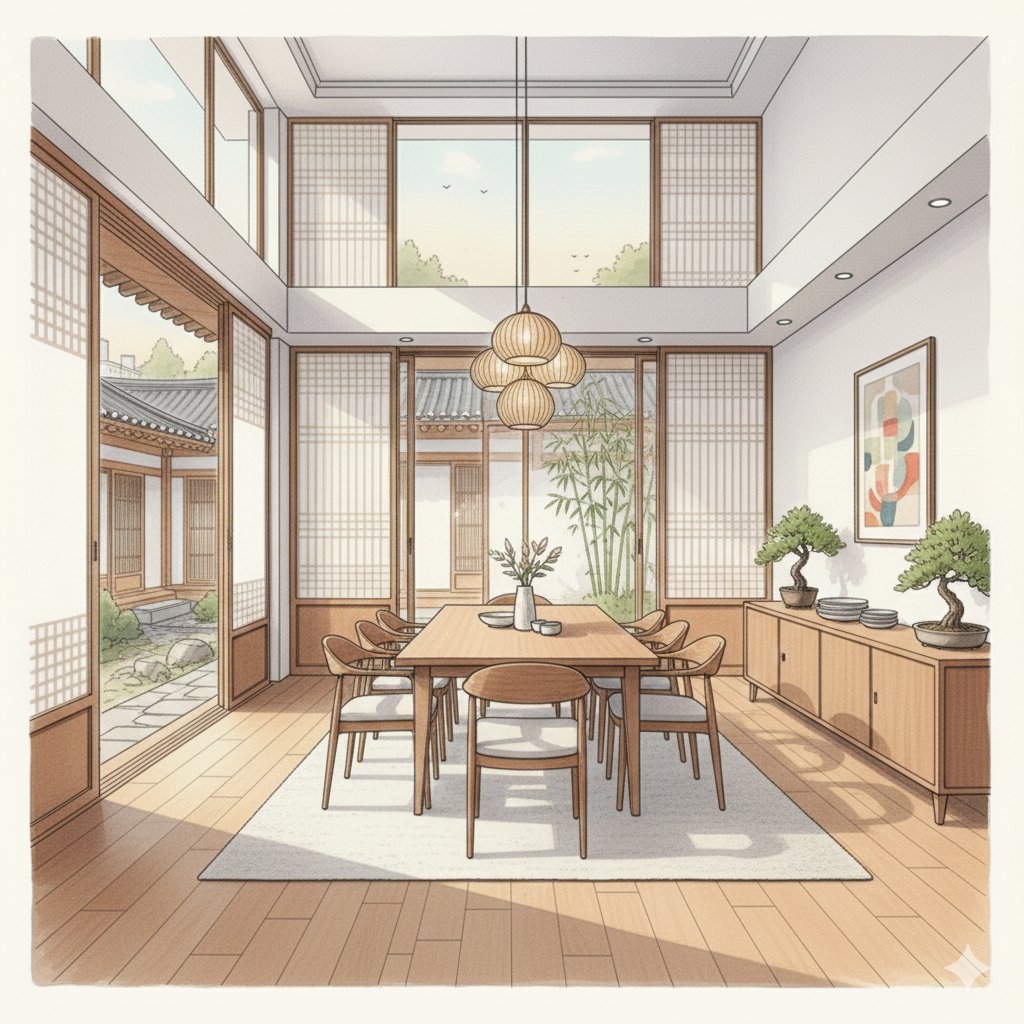 아침이면 천창 너머로 쏟아지는 햇살이 주방을 가득 채우고, 저녁엔 가족이 모여 앉아 따뜻한 밥냄새와 웃음이 가득한 풍경이 그려집니다. 지하 다이닝룸의 긴 테이블 위로는 하루의 이야기가 천천히 내려앉습니다. 서울의 소음은 멀리 있고, 오직 바람과 나무의 소리만 남습니다. 🌳